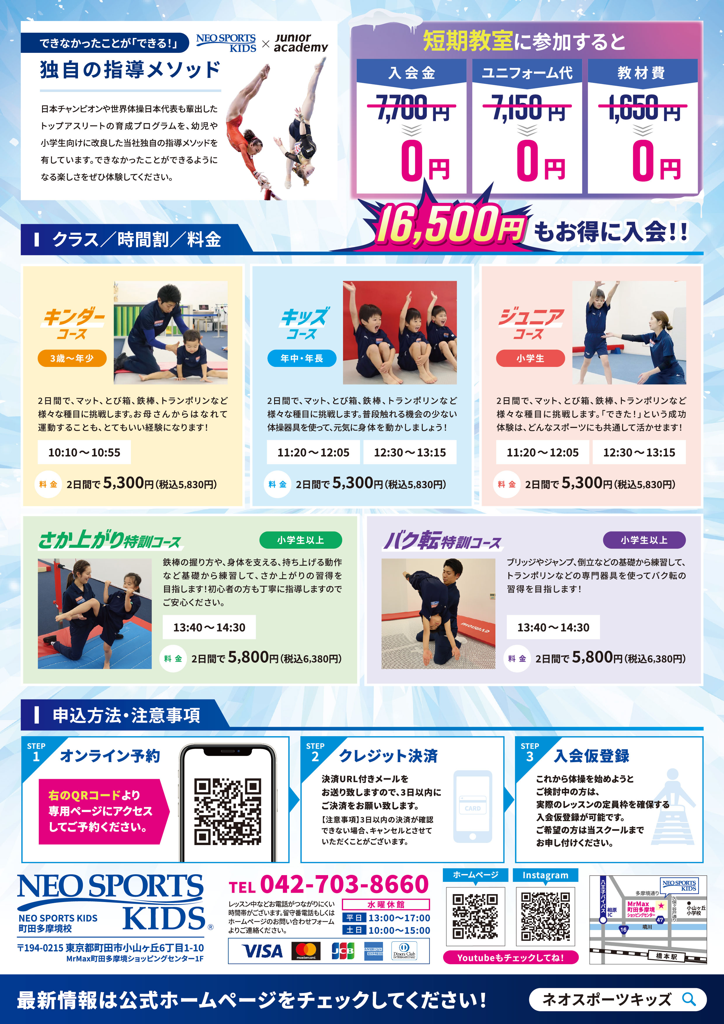 ブリッジやジャンプ、倒立などの基礎から練習して、トランポリンなどの専門器具を使ってバク転の習得を目指します!