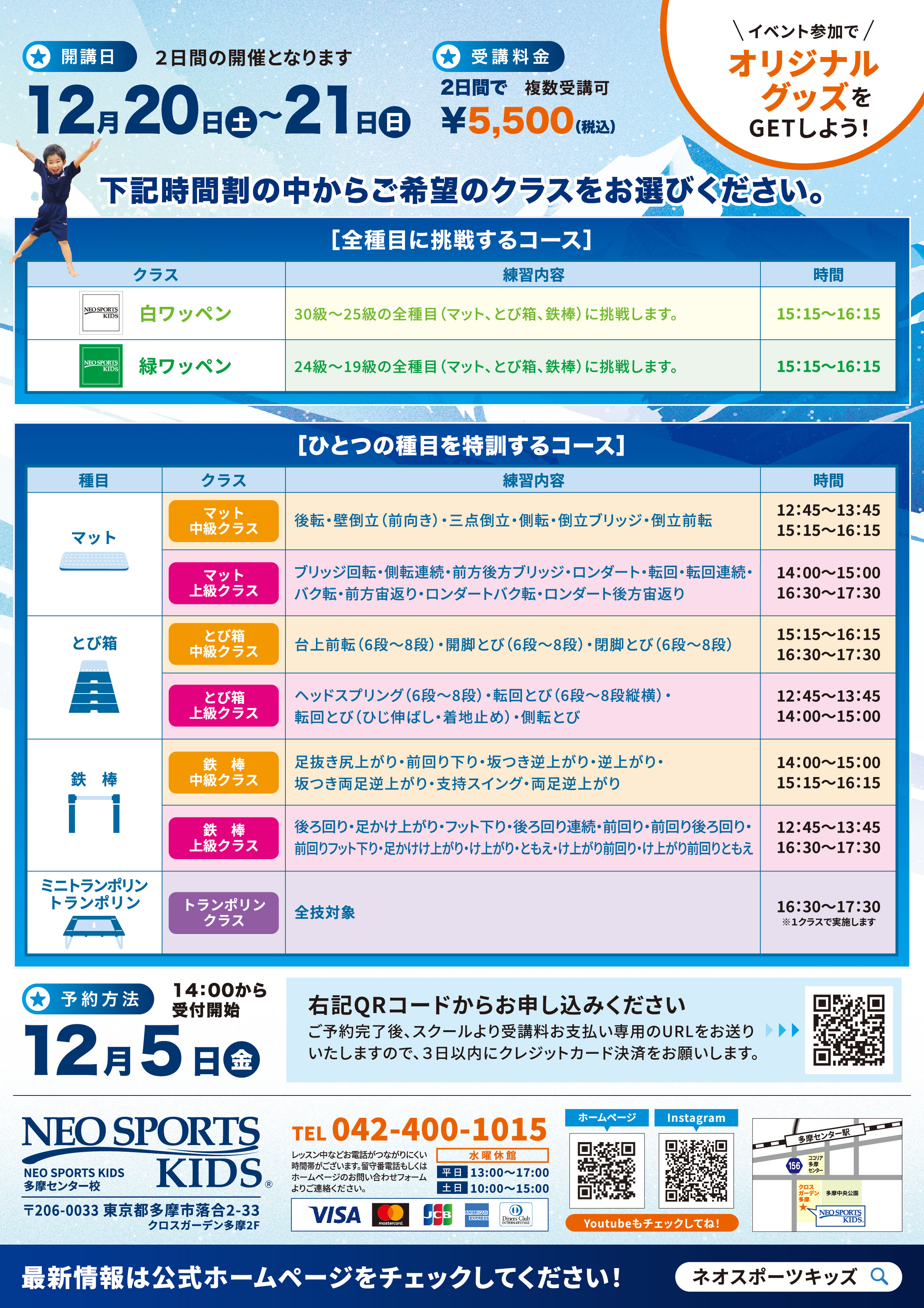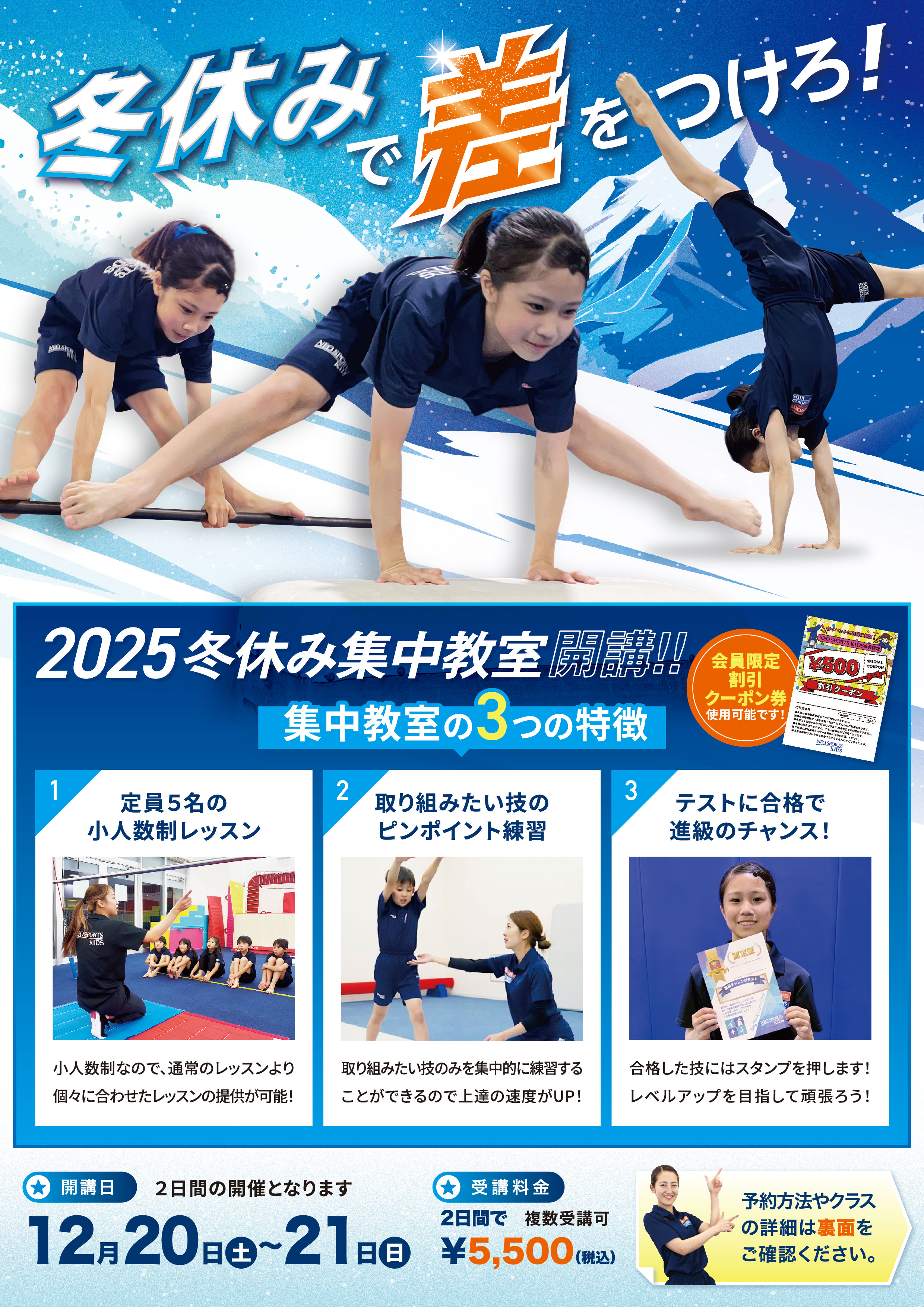 進級テストで合格できなかった技や、お子様の取り組みたい技を2日間集中的に練習する1クラス5名以下の少人数制クラスです🤸✨