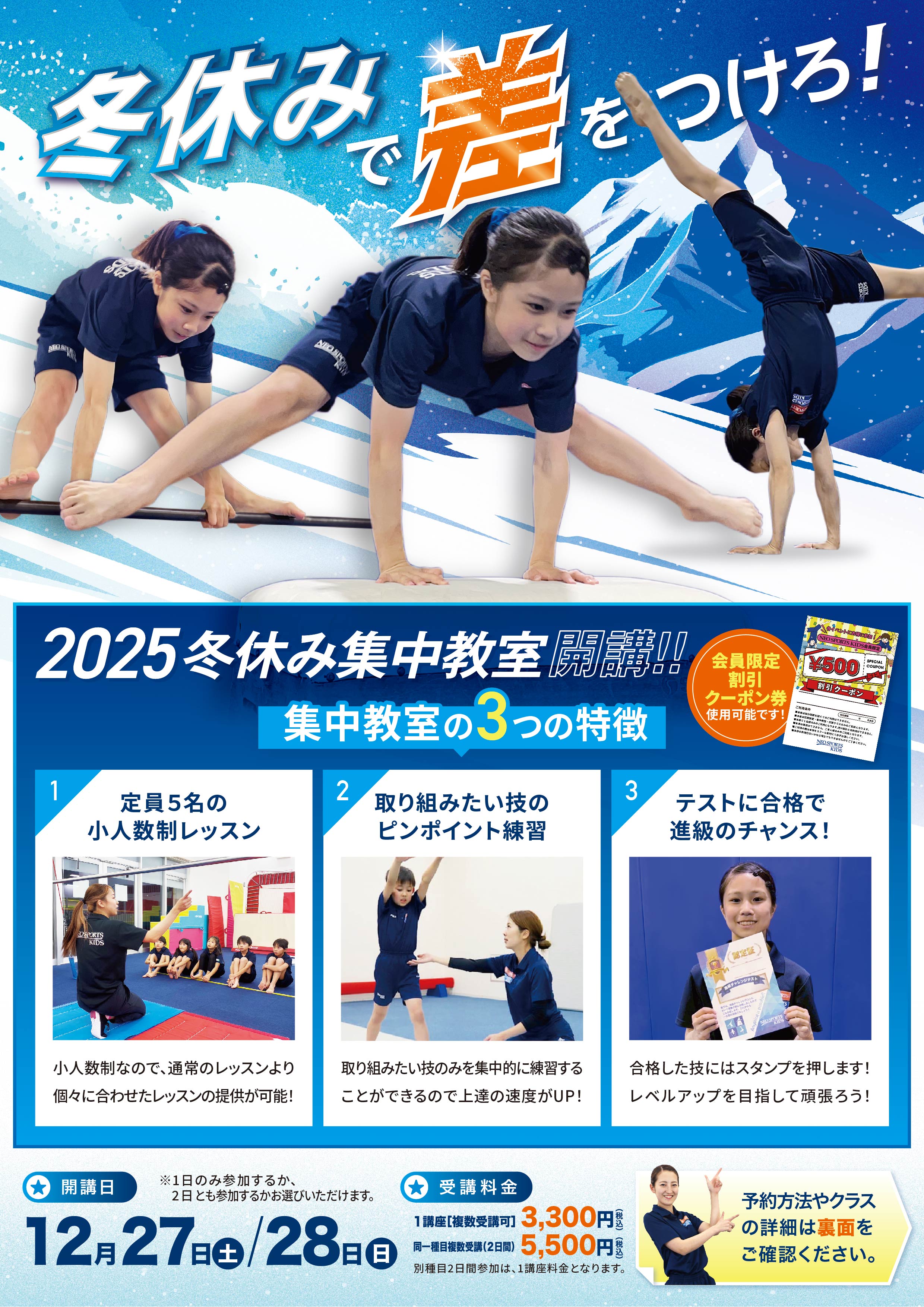 チラシ「夏休み集中教室」に記載の表をご確認いただき、練習したい技の該当クラスにお申し込みください📲