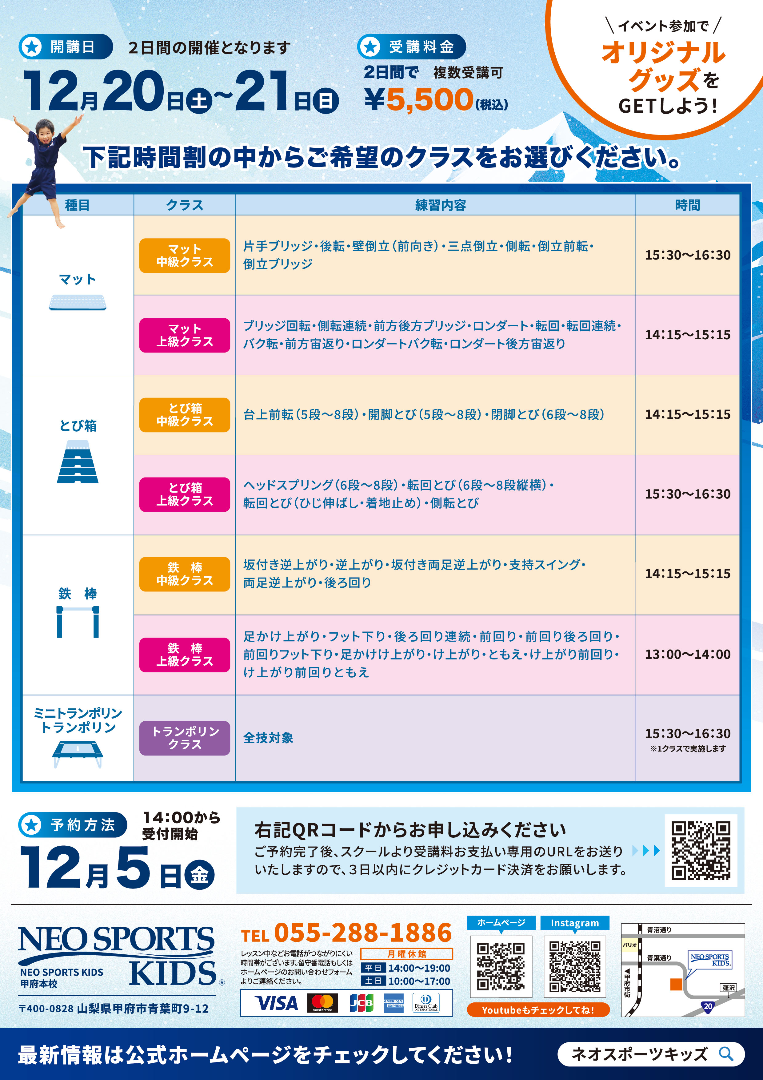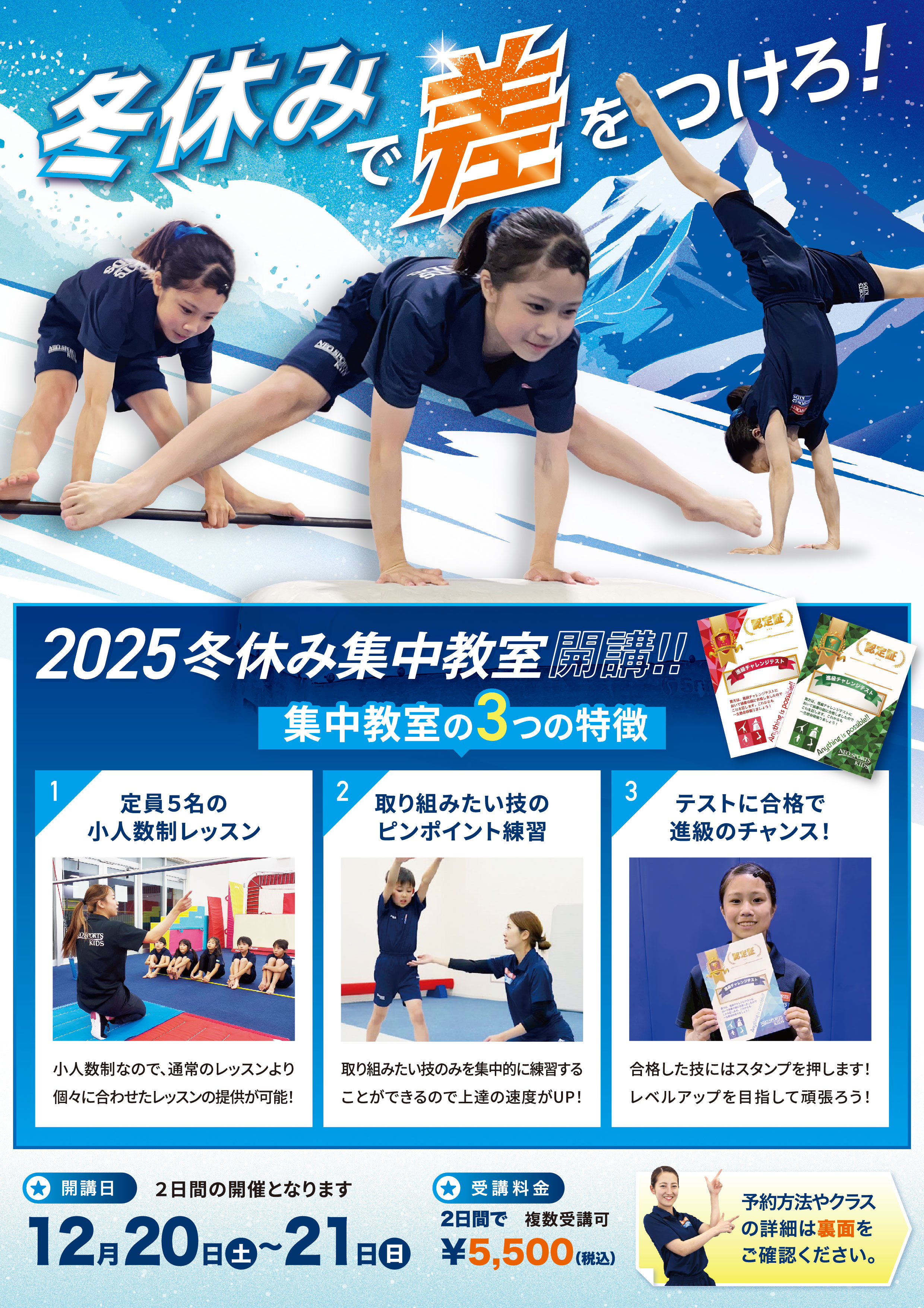 進級テストで合格できなかった技や、お子様の取り組みたい技を2日間集中的に練習する1クラス5人以下の少人数クラスです🤸