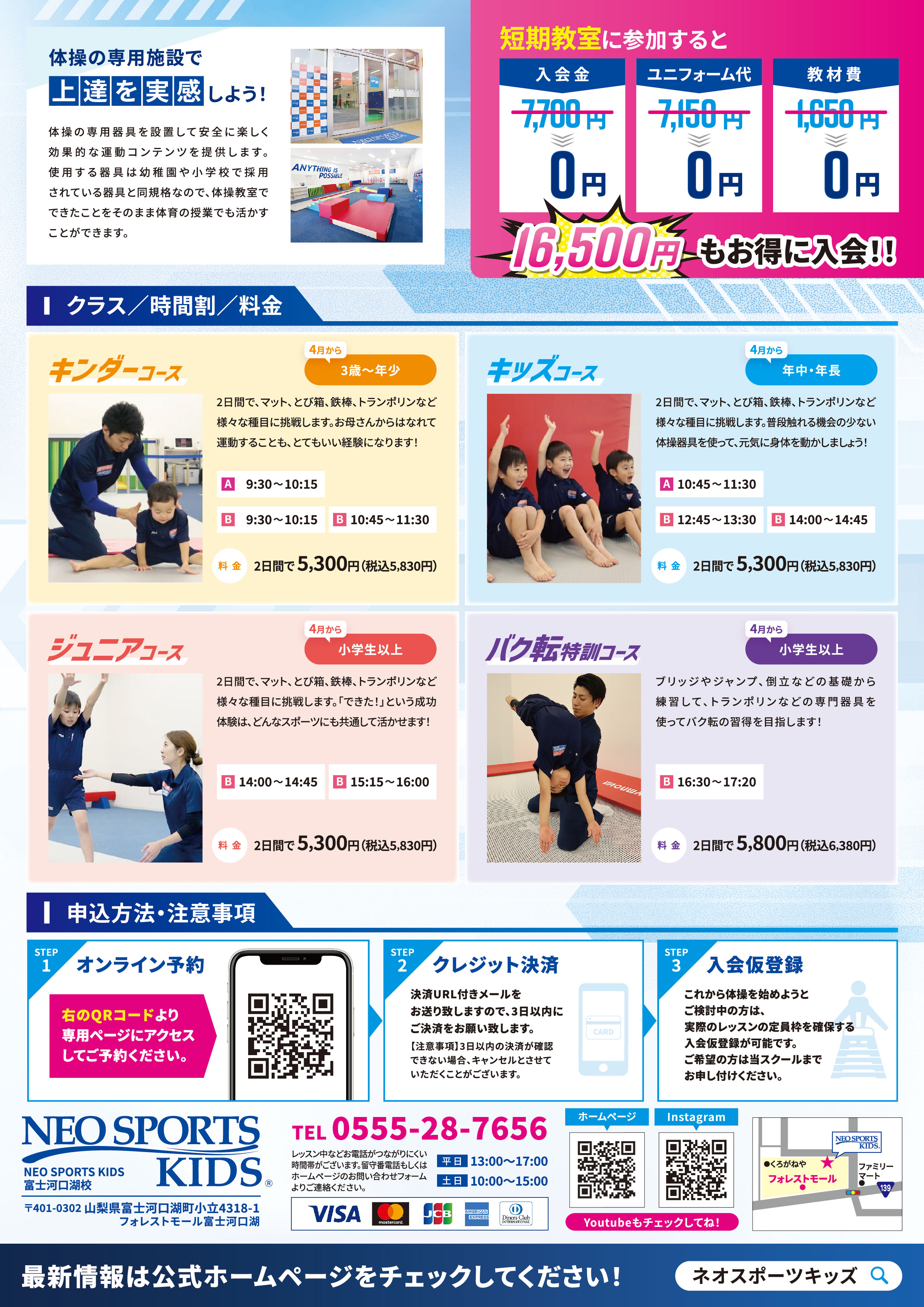 ブリッジやジャンプ、倒立などの基礎から練習して、トランポリンなどの専門器具を使ってバク転の習得を目指します!